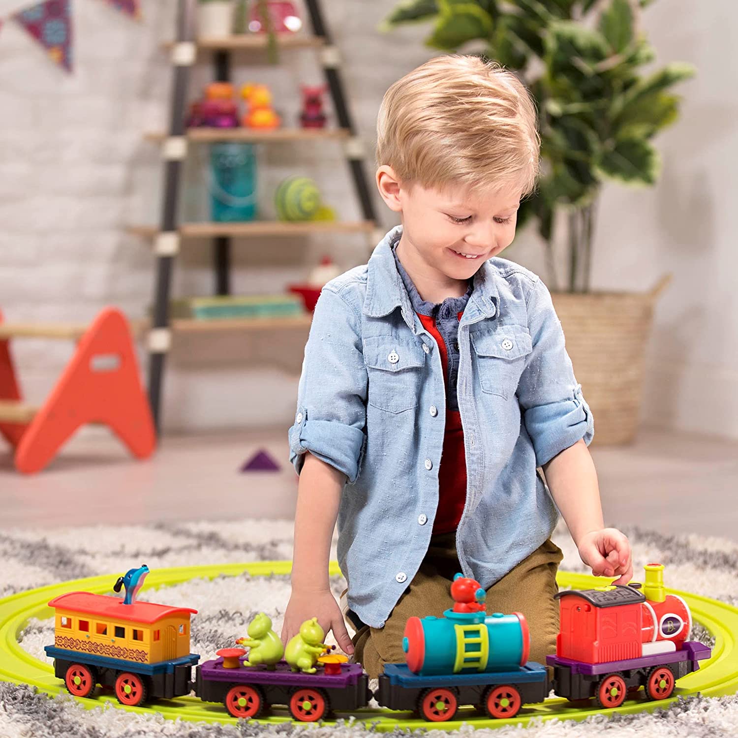Tutti a bordo! Questo treno musicale motorizzato è pronto per il tour. Costruisci la ferrovia collegando tutti i binari insieme, collega i 4 vagoni magnetici e poi scegli la modalità che fa per te: modalità motorizzata per guardare il treno girare da solo, oppure modalità Kid-Powered per controllare il viaggio. E se vuoi una festa, basta premere il pulsante musica e le creature prenderanno vita! Guarda il gatto che volteggia, il cane e le rane che suonano! Con luci e suoni. Gioco ideale per migliorare le capacità motorie.